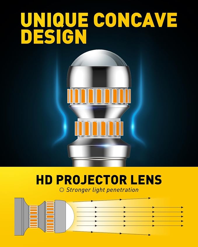 - Resembling halogen bulb shape design and sequencing 54 4014-SMD LED chips precisely around the 1156 led amber bulb. Delivering 360° high luminous efficiency with full amber yellow light, see more clearly and safely when driving