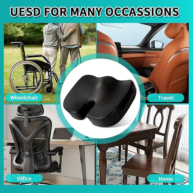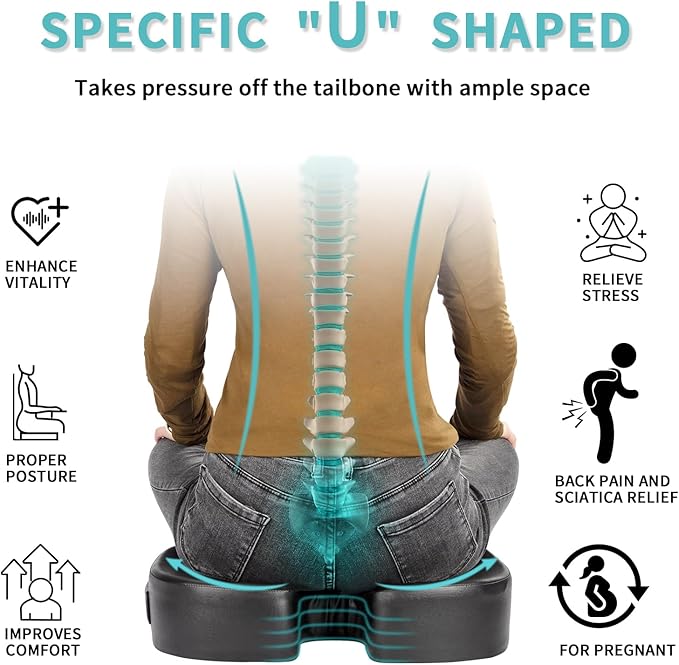 - ✅[Ergonomic Design & Comfortable Foam]: Our U-shaped design coccyx cushion is engineered to perfectly contour to the curves of hips, improving blood circulation. It effectively alleviates problems like lower back pain and sciatica caused by prolonged sitting. The 4-inch thickness of the memory foam provides ample support, reducing pressure on buttocks, lower back. It offers a soft and comfortable feeling, ensuring that the cushion retains its shape even after long periods of sitting.