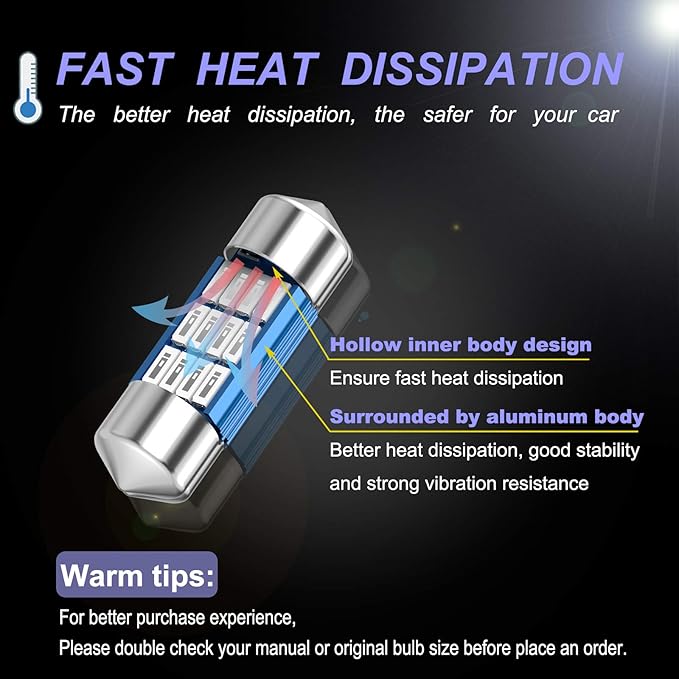 - 【UPGRADE VERSION】 2PCS Festoon DE3175 led bulbs build-in smart IC driver for constant current. CANBUS error free for 98% vehicle. Aluminum body surround and hollow inner body design, High temperature resistance, Ensure fast heat dissipation and long life last up to 50,000 hours.