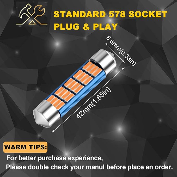 - 【Wide Application】1.65in 578 led bulbs can be use as led interior car lights, led license plate light, led interior map light, led dome light, led reading light, dash board light, side door courtesy light, glove box light, trunk cargo room light, instrument lamp door light etc.