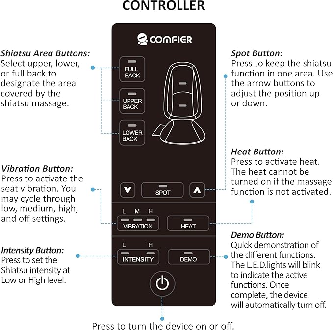 - Customizable Massage Zones:Comfier back massager for chair With the ability to focus on specific areas, you can tailor your massage to your needs. Choose from full back, upper back, or lower back options, or use the SPOT massage feature to target precise areas for relief from knots and discomfort.
