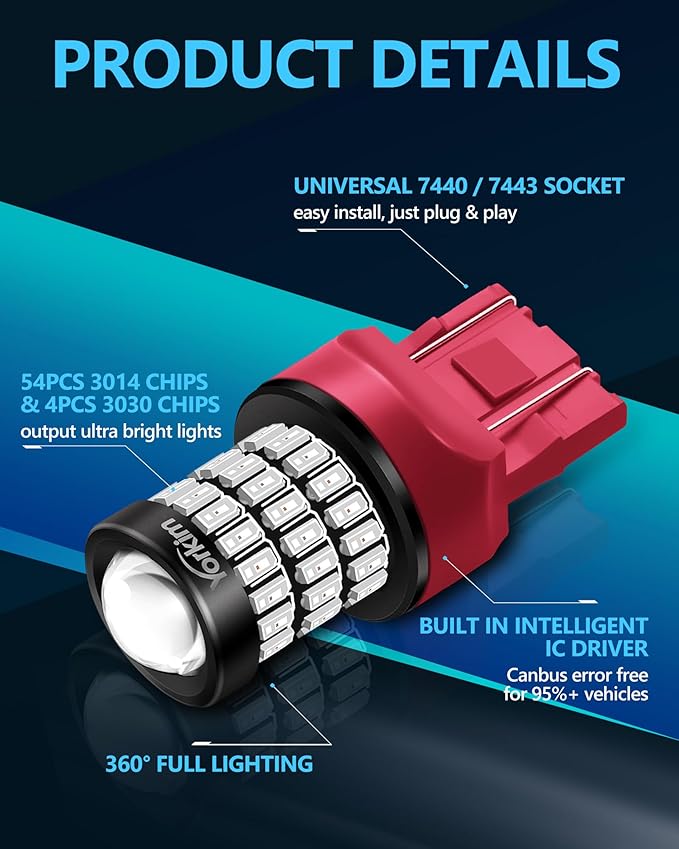 - 【360° Lighting】Yorkim 4pcs 7440 LED bulbs red utilize high quality 58pcs 3014SMD & 4pcs 3030SMD led chips with HD projector, 300% brighter than halogen 7440 bulb, offer optimal visibility and stronger light penetration, no dark spots, no sharow area