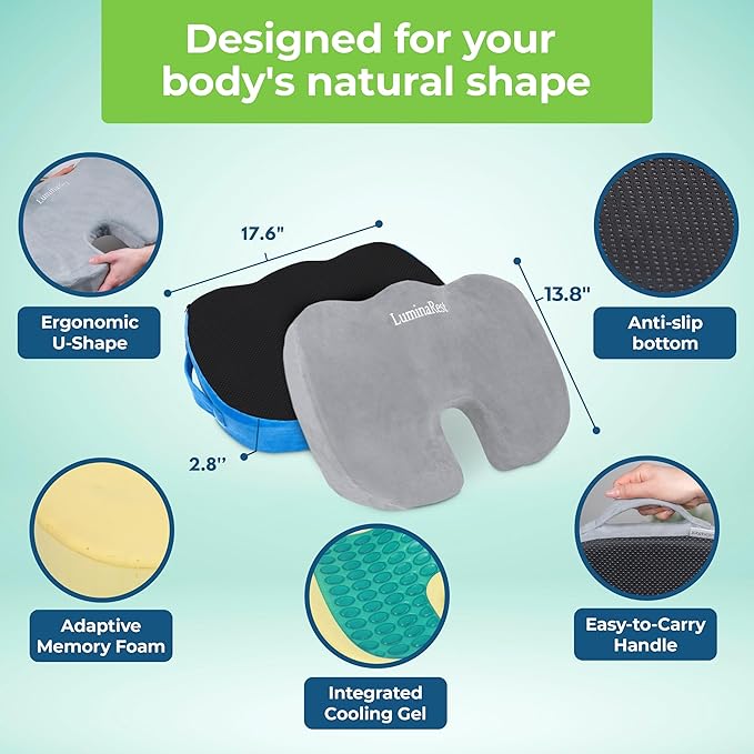 - Ergonomic U-Cutout for Tailbone & Back Pain Relief – Coccyx design relieves tailbone pain, lower back pain, and sciatica by reducing pressure while sitting.