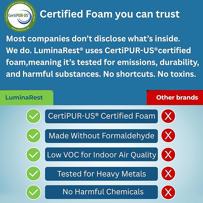 - CertiPUR-US Certified Memory Foam + Cooling Gel – Tested by certified labs. Made without harmful chemicals, mercury, lead, or heavy metals. Cooling gel delivers lasting comfort.
