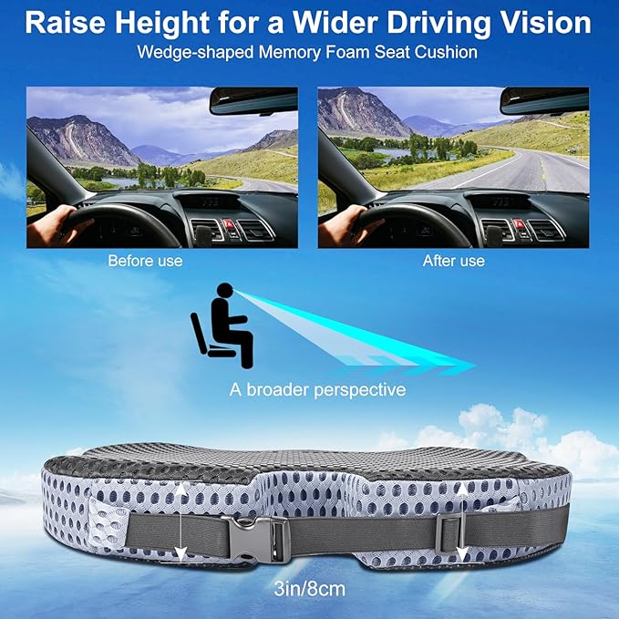 - 【Innovative Wedge-shaped Design】 PACJOY car seat cushion features a wedge-shaped design, with the front lower and the back higher.It perfectly complements the curved shape of car seats which are higher in the front and lower in the back. The front lower design allows for natural relaxation of the legs while driving. The back higher design provides a broader field of driving vision.
