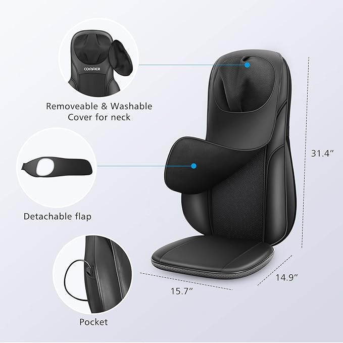 - Extra Flap:Comfier neck and back massager with heat also provides massage for the waist and hips. With an additional flap, the Comfier back massagers for back pain deep issue allows you to choose between gentle and intense massages, catering to individual preferences.This shiatsu back massager is 15.7'' in length, 14.9'' in width and 31.4'' in height,which is fit for most standard - sized chairs.
