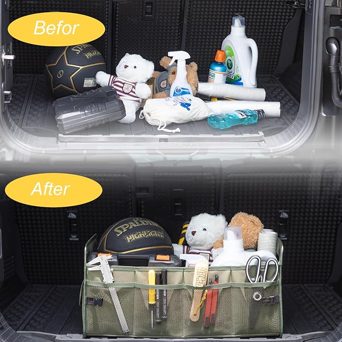 - FOLDABLE CAR ORGANIZER: The car storage organizer can be shrunk or unfolded to fit in the trunk, perfect for business trips travel and supermarket shopping. It can be folded to half length and used as a seat organizer. It can be collapsible completely when not needed and secured with buckle, not easy to fall apart and easy to store.