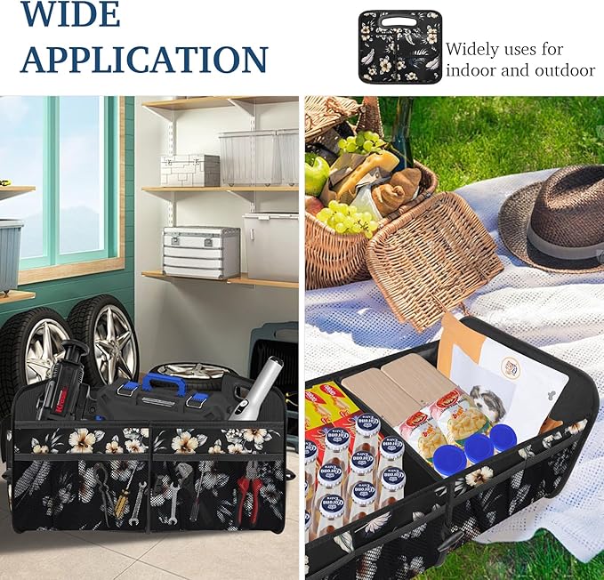 - 【Trunk Organizer for Car】:This is the optimal solution for maintaining a clean car interior as car accessories. Suitable for all vehicle types, like trucks, SUVs, vans, jeeps, cars, etc., and it's fantastic for transporting and arranging groceries, toys, athletic equipment, tools, and more in your trunk. Eliminate trunk clutter situation with this car organizer.