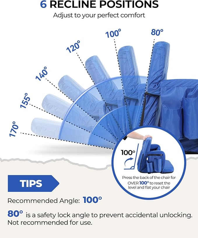 - 6 Adjustable Recline Positions: No more worries about back, neck, and shoulder strain. Find your perfect angle with 6 recline options for your desired comfort and support—from fully upright to completely flat. Perfect for stadiums, parks, beaches, camping, fishing, and more.