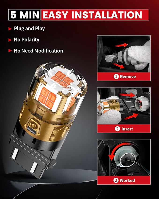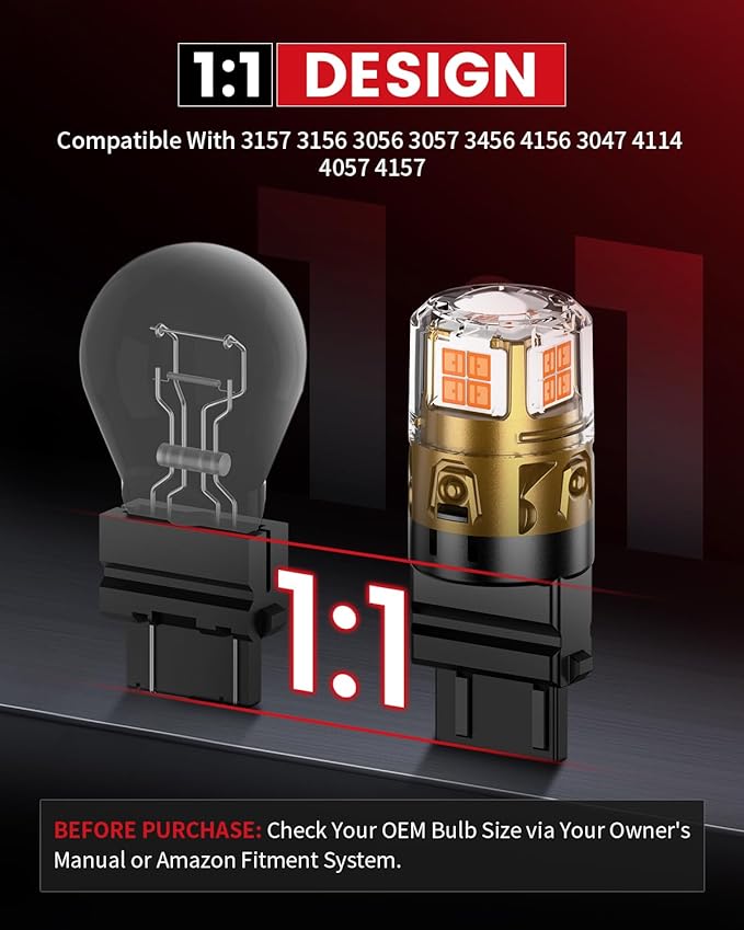 - True Plug-and-Play Fit. 1:1 size based on factory 3157 halogen bulbs. Fits securely with no loose wiring. Installation takes just minutes for most vehicles. Solid construction with premium materials, no need to be replaced nearly as often. Definitely worth it if you want better visibility