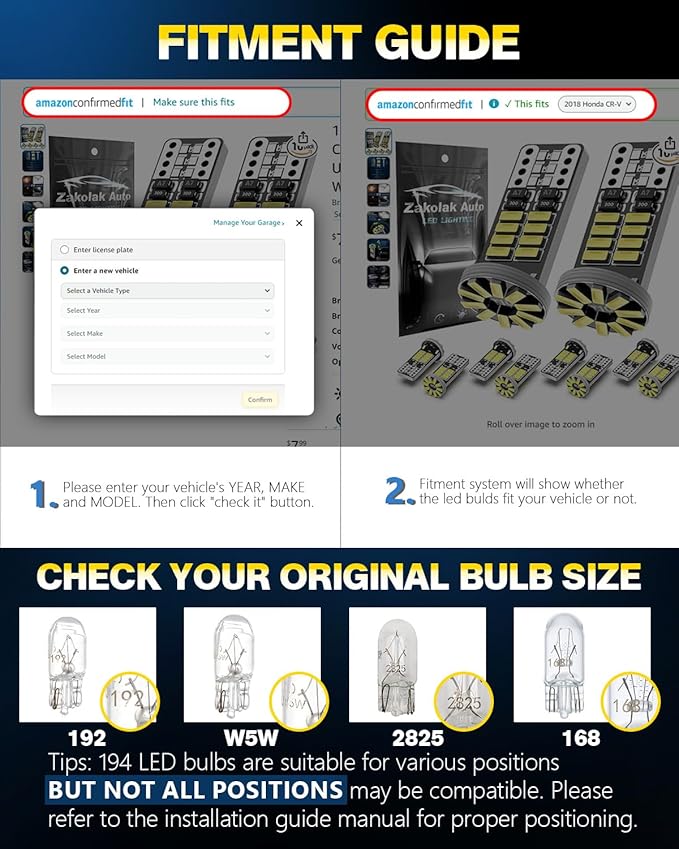 - 【97% Vehicle Compatibility】: Compatible with multiple LED bulb models including T10, 194, 168, 147, 152, 158, 159, 161, 175, 184, 192, 193, 2825, W5W. Suitable for various vehicle positions such as license plate lights, car interior door lights, RV interior lights, dome lights, parking lights, side marker lights, trunk lights, courtesy lights, map lights, glove box lights, and more, offering a bright upgrade to refresh your car's appearance.