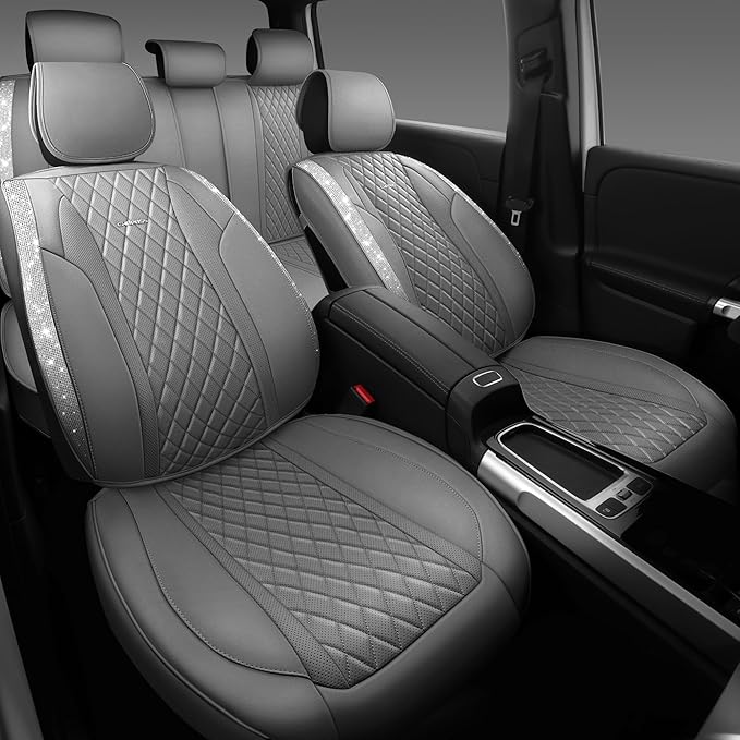 CAR PASS Gray Leather Bling Car Seat Covers Full Set, Luxury Microfiber Nappa PU Cushioned, Waterproof Anti-Slip Universal Fit for Auto SUV Sedan Sparkly Glitter Shining Rhinestone, Gray Diamond