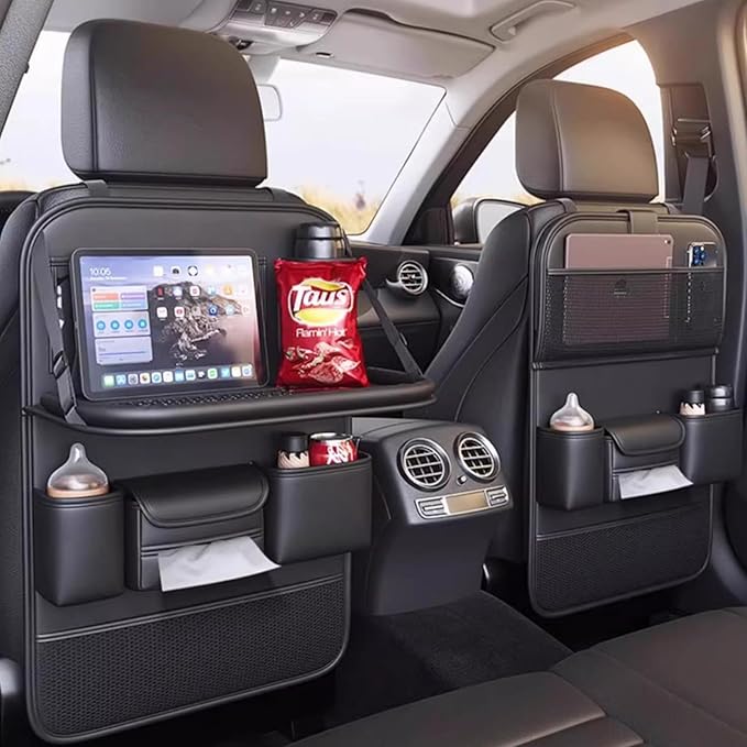 Foldable Car Table for Backseat Headrest with Big Pockets Waterproof Leather, Back Seat Car Organizer with Tray, Seat Organizer for Backseat