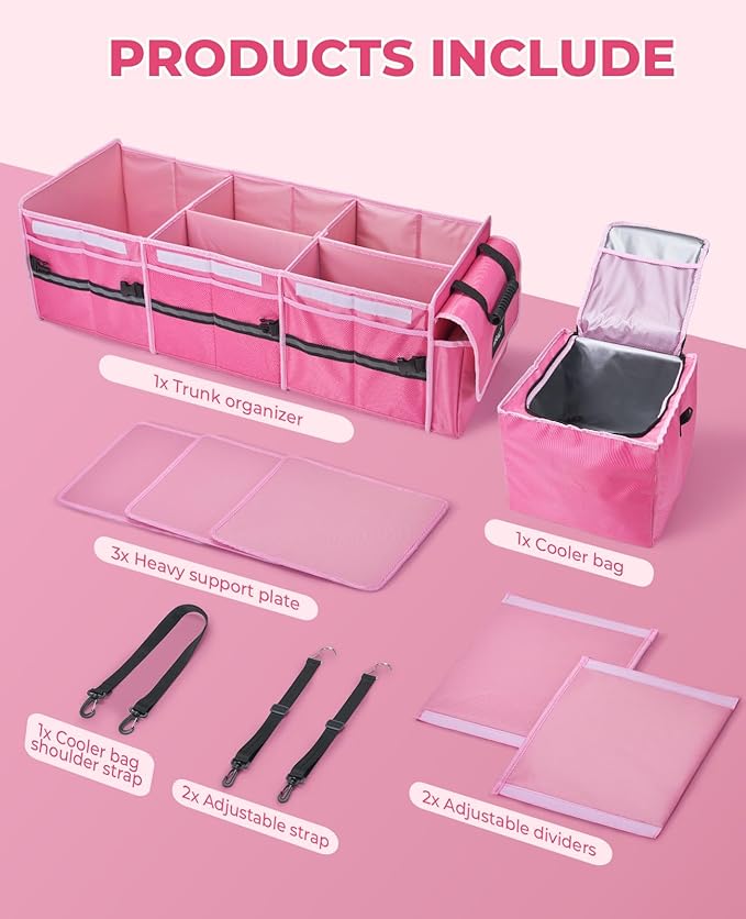 - 4-in-1 Trunk Organizer with Cooler Bag: Three separate compartments and a thermal insulation bag. It also has 12 side mesh pockets and 2 flip pockets for more storage needs. The independent insulation bag can keep warm or refrigerated