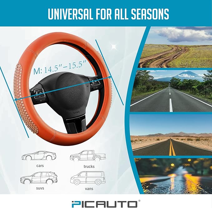 PIC AUTO Steering Wheel Cover, Glitter Gel Particles & Orange Luxury Leather Car Steering Cover, Universal Fit 14.5"-15.5" Anti-Slip Car Wheels Cover for Girls & Women