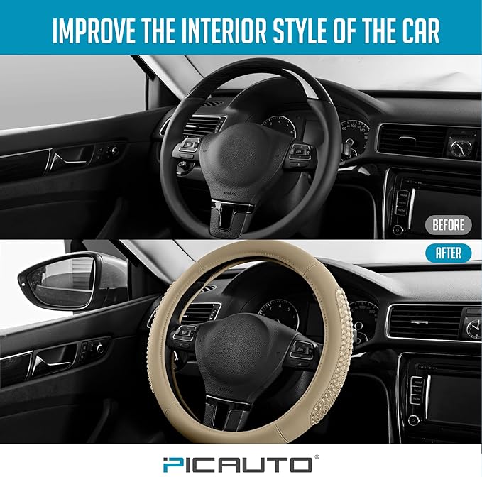 PIC AUTO Steering Wheel Cover, Glitter Gel Particles & Beige Luxury Leather Car Steering Cover, Universal Fit 14.5"-15.5" Anti-Slip Car Wheels Cover for Girls & Women