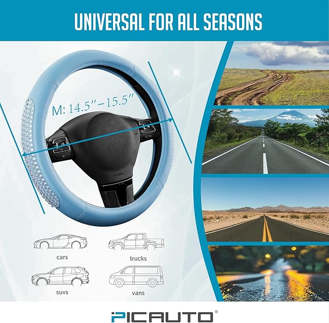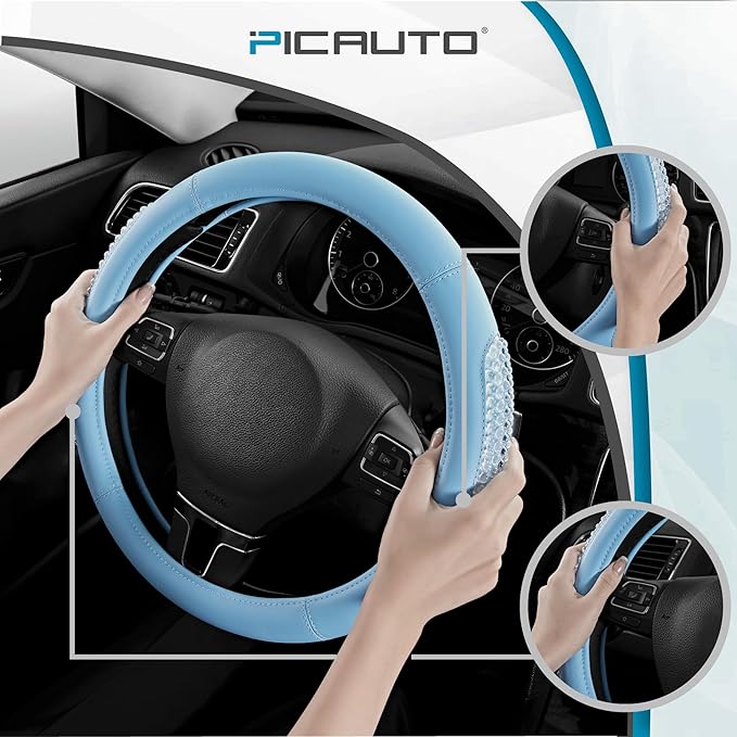PIC AUTO Steering Wheel Cover, Glitter Gel Particles & Blue Luxury Leather Car Steering Cover, Universal Fit 14.5"-15.5" Anti-Slip Car Wheels Cover for Girls & Women