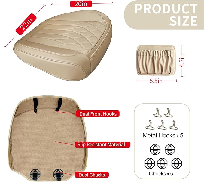 - Keep in place and easy to install: This front car seat cover has a non-slip gel bottom, with chucks and hooks to keep it in place well. It's also easy to install, insert the chucks into the gap between the seat back and the bottom, attach the hook under the seat bottom, then use the buckle to fasten the long elastic strap to the seat back, you can easily finish it in about 5 minutes Install.