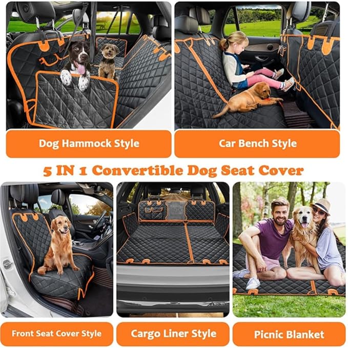 - 5 in 1 MULTIFUNCTIONAL DOG CAR SEAT COVER. The 60/40 split dog seat cover can be easily transformed into a dog car hammock, bench seat cover, passenger-friendly style, pet front seat cover, trunk cargo liner, or picnic mat. Standard size 53" W x 59" L. It also allows children and pets to share the back seat together. (Note: the dog seat cover does not come with a hard bottom). Car seat covers Truck accesories