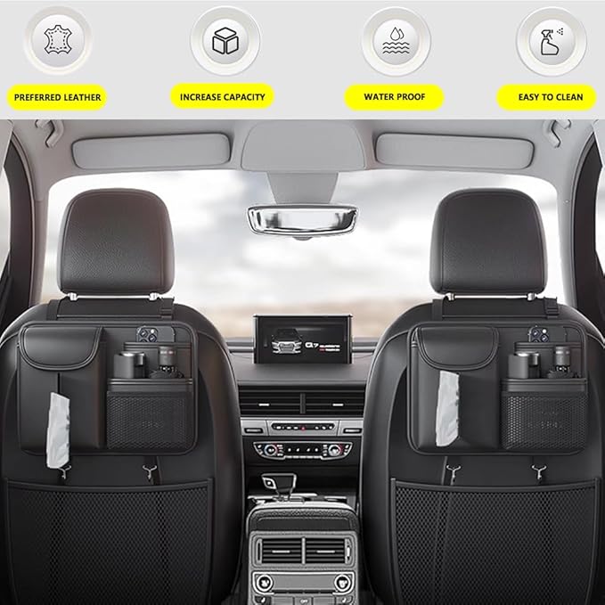 - 【LARGE STORAGE CAPACITY】:This car storage organizer has multiple pockets for mobile phones, wallets, toys, snacks, tissues, etc. There are also two hooks at the bottom to hang your umbrella, bag or garbage bag. It will make your car cleaner and neater.