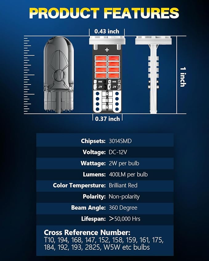 - 【300% Brightness Increase】: Each pack includes 10 T10/194/168 LED bulbs, each equipped with 25 pieces of 3014 SMD LED chips. They operate at 12V with a power consumption of 2W per bulb, and produce a lumen output of 400lm per bulb, resulting in a 300% increase in brightness. They offer 360°full-angle illumination with no blind spots, ensuring clearer visibility at night.