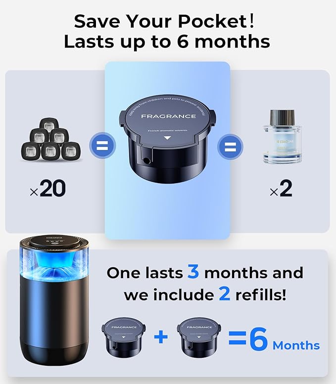 - 【6 Months Long Lasting】Comes with two essential oil refills. The built-in counter allows each refill to spray up to 1,200 times. If you drive 10 hours per week, the two refills can last up to 6 months. Currently available in six scents and still being updated