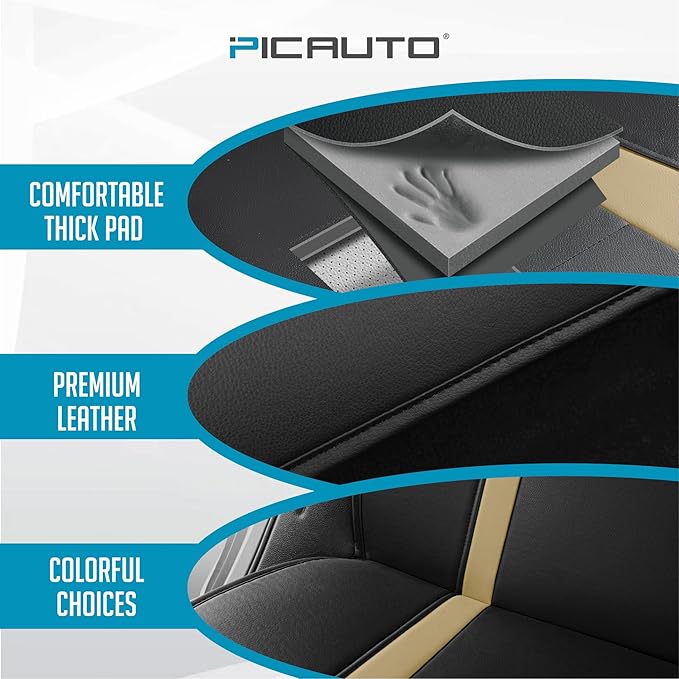 PIC AUTO Leather Car Seat Covers, Premium Automotive Waterproof Front & Rear Full Set Bucket Car Seat Protectors, Black and Beige PVC Patchwork, Fits for Cars, Trucks, Van, SUV, Airbag Compatible