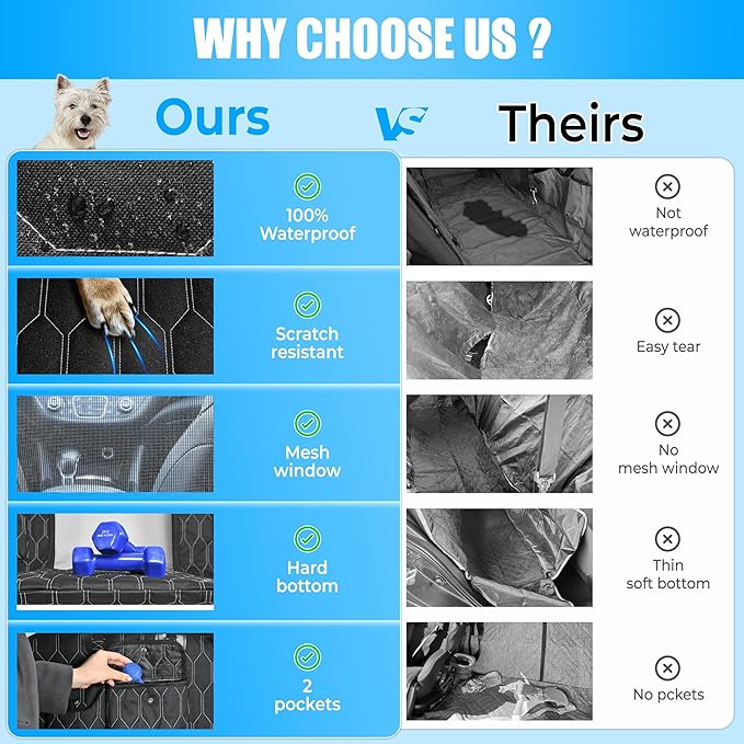- STURDY HARD BOTTOM - Our backseat dog cover hard bottom for dogs features sturdy fiberboard that outperforms traditional wooden boards in mold resistance. It can hold up to 400 pounds, suitable for large dogs or multiple dogs. Very secure dog car cover.