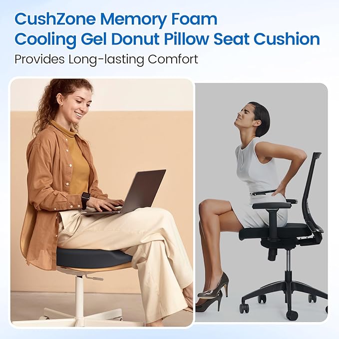 - [Premium Memory Foam & Cooling Gel]: CushZone donut pillow floor cushion measures 17" x 13.5" x 2.8". Made with premium high density memory foam and cooling gel, CushZone donut pillow seat cushion effectively provides support and stays cool even after prolonged use. The gel layer efficiently dissipates heat, ensuring a comfortable seating experience