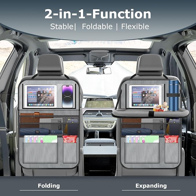 - Perfect for On the Trip: The back seat organizer with tray is specifically designed for vehicle trunk organization. Whether you're a busy professional needing a mobile workspace, a parent seeking to entertain children for road trips or someone simply looking to keep their car interior tidy, our car seat back organizer is the perfect solution as well as a great gift for friends, parents on vacation and daily organization
