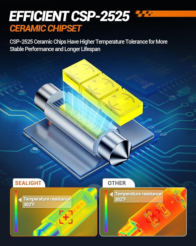 - High Quality LED Interior Light: 578 led dome light bulb for cars are made of the latest 2525 high temperature resistant ceramic chipset, which has 30° higher temperature resistance than ordinary chips, this means that when working at high temperatures, our 578 LED bulb are more stable, effectively extending the life of the bulb.