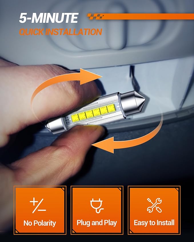 - 5-Minute Installation: 6418 led bulb interior car lights are non-polarized, plug and play, 1:1 size, super easy to install. Amazon filter system may not be 100% accurate or up to date, the bulb socket size may vary between trim of your vehicle, please double check owners manual or original bulb size before ordering.