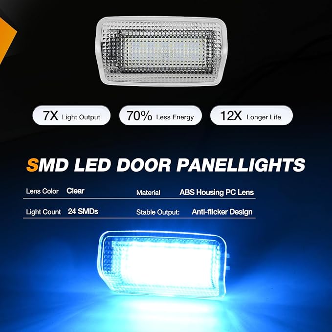- Build to last & Super Bright: Made of premium ABS housing and lens, won't faded at long-time exposure; 6 times brighter than original incandescent bulb housing light. Built-in high power SMD LED chips to maximize illumination on the interior side doors