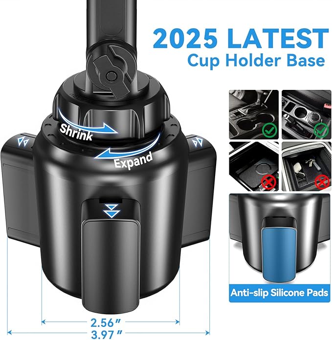 - Better Protection for Your Beloved Car: No suction cup and vent clip. No need to stick anything on the dashboard or windshield, just place the cup holder phone mount on the car cup holder and fix it to use, it wonβt bring unremovable sticky stains to your car. Moreover, don't worry anymore break the vent blades and also won't damage your dashboard, you can be used safely with your beloved car.