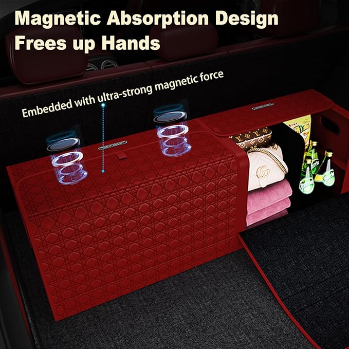 - [Large Capacity]-The size of GMQ car organizer and storage space is 29.5 * 13 * 12.5 inches (length x width x height). It not only has a large capacity, but can also be expanded and molded to store various items. It can be folded into 8.5CM thin sheets. Creative magnetic design, easy to switch, full of a sense of luxury.
