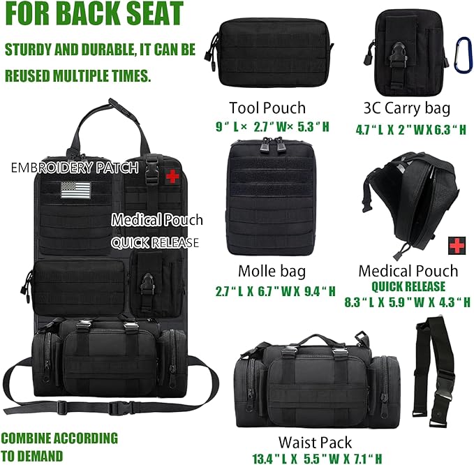 - Package included:1*tactical molle seat back organizer,1*Tactical Molle Bag,1*Tool pouch,1*Cell Phone Pouch,1*Medical Pouch,1*Multipurpose Waist Pack.1*Removable shoulder strap.1*biner.Can protects your seat from scratches and stains.