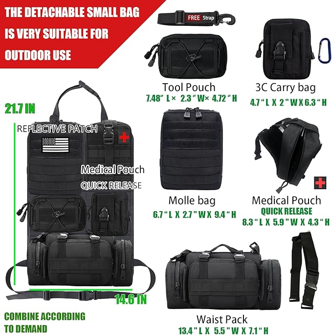 - Package included:1*tactical molle seat back organizer,1*Tactical Molle Bag,1*Tool pouch,1*Cell Phone Pouch,1*Medical Pouch,1*Multipurpose Waist Pack.1*Removable shoulder strap.1*biner.Can protects your seat from scratches and stains.