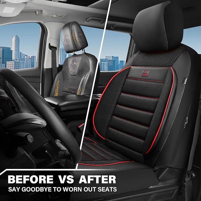 - 【UNIVERSAL FIT & EASY INSTALLATION】The seat covers are compatible with most vehicles, sedan car SUV pick-up and trucks. Compatible with vehicles with front seats with side armrest.Easy to install, no tools required. The installation instruction is included in the package. We recommend you read the instruction manual step-by-step for guidance. Due to packaging, the product unfolds with wrinkles, the seat cover will spring back and recover a week after installation.