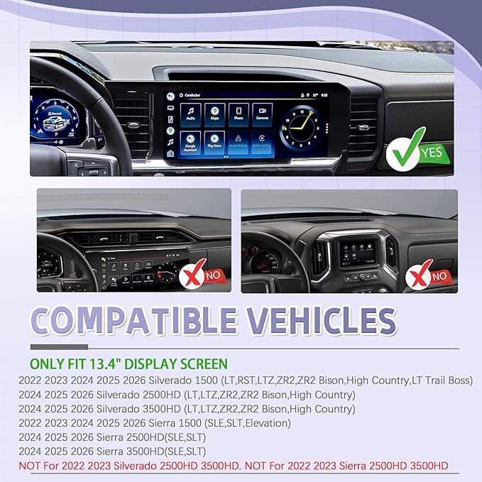 - [ Note ] : ONLY For 13.4" display screen. Please confirm the size of your display carefully before buying. NOT For 2022 2023 Silverado 2500HD 3500HD. NOT For 2022 2023 Sierra 2500HD 3500HD.