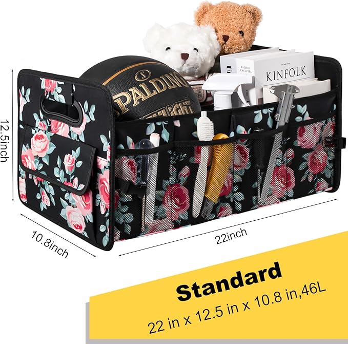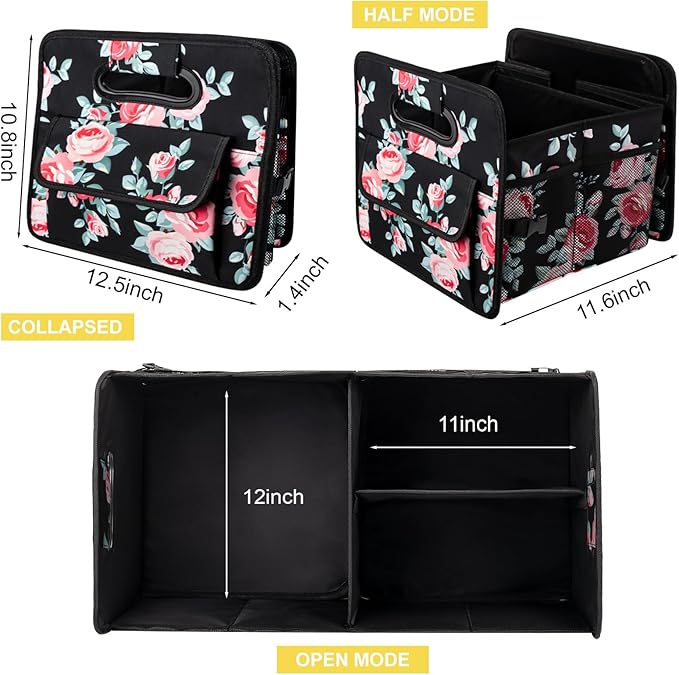 JiatuA Car Trunk Organizers and Storage Collapsible Multi Compartment Container Box, Adjustable Car Accessories for SUV Sedan Truck, Standard Size, Black Floral