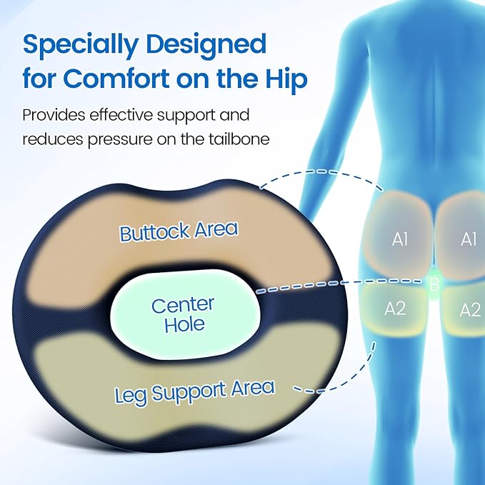 - [Donut Shape for Pressure Relief]: The U-shaped and center hole design of the memory foam & cooling gel donut pillow seat cushion helps to relieve pressure on the hips and provide long lasting comfort