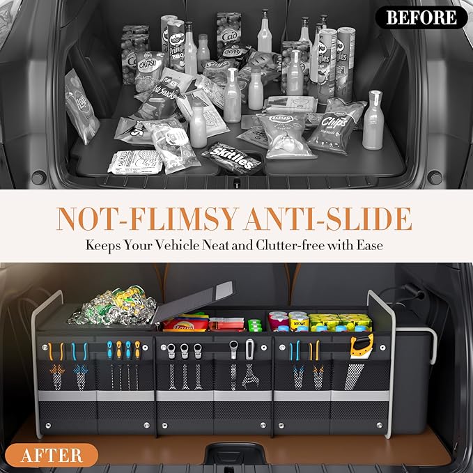 - Well-Designed and Sturdy Organizer: This organizer easily folds down compact and lies flat when not in use. · Durability and Stability: When set up, it’s sturdy with compartments perfectly sized for plastic grocery bags, keeping them in place with adjustable dividers. It features a non-skid pad for stability and tie-down straps for added security, making it ideal for organizing items in the back of your Car/SUV/Truck.