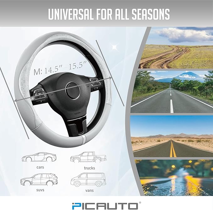 - UNIVERSAL SIZE - Perfect Fit for Most Steering Wheels: Engineered to fit standard steering wheels ranging from 14.5” to 15.5” in diameter, this universal-fit cover is ideal for most sedans, SUVs, trucks, and crossovers. It's a must-have upgrade for your steering wheel protection and style.