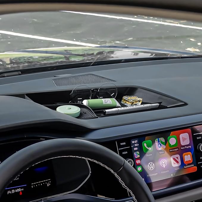 Dash Storage Tray Compatible with Volkswagen Taos 2022 2023 2024 Interior Accessories, Center Console Dashboard Mounted Organizer Sunglass Holder Non Slip Pad Behind Screen Black (Not for 2025)