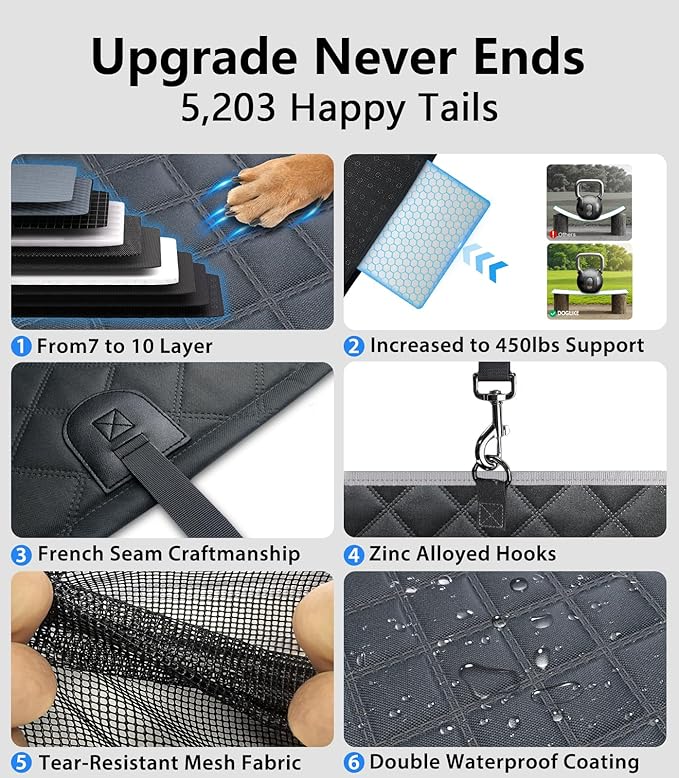 - ๐๐ข๐ฅ๐ข๐ญ๐๐ซ๐ฒ-๐๐ซ๐๐๐ ๐๐-๐๐๐ฒ๐๐ซ ๐๐ก๐ข๐๐ฅ๐: Hard bottom dog hammock with triple-coated 600D Oxford fabric + PVC waterproof layers block urine & scratches, while PP honeycomb boards (layers 6-8) withstand 450lbs โ guarding your truck seats against claws, drool, and accidents.