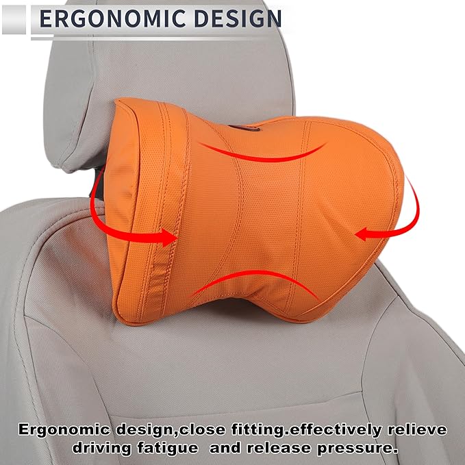Car Headrest Pillow Ergonomic Comfortable Neck Support Pillow Nappa Leather and Memory Foam Adjustable Width Orange 1 Pcs for Driving Travel
