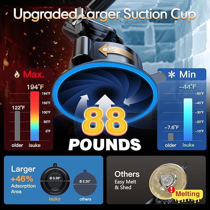 - [Superior Suction Cup, Never Fall Off] Different from other suction cups on the market, this car phone holder equipped with latest big suction cup and 2-level locking, large 3.35” Diameter of suction cup mechanism has been tested out by isuke laboratory, 3x stronger than standard suction. Provides up to 80lbs of holding power, ensuring rock-solid stability even on rough roads. Note: ① Make sure that the surface should be smooth. ② Reuse after rinse & air-dry.