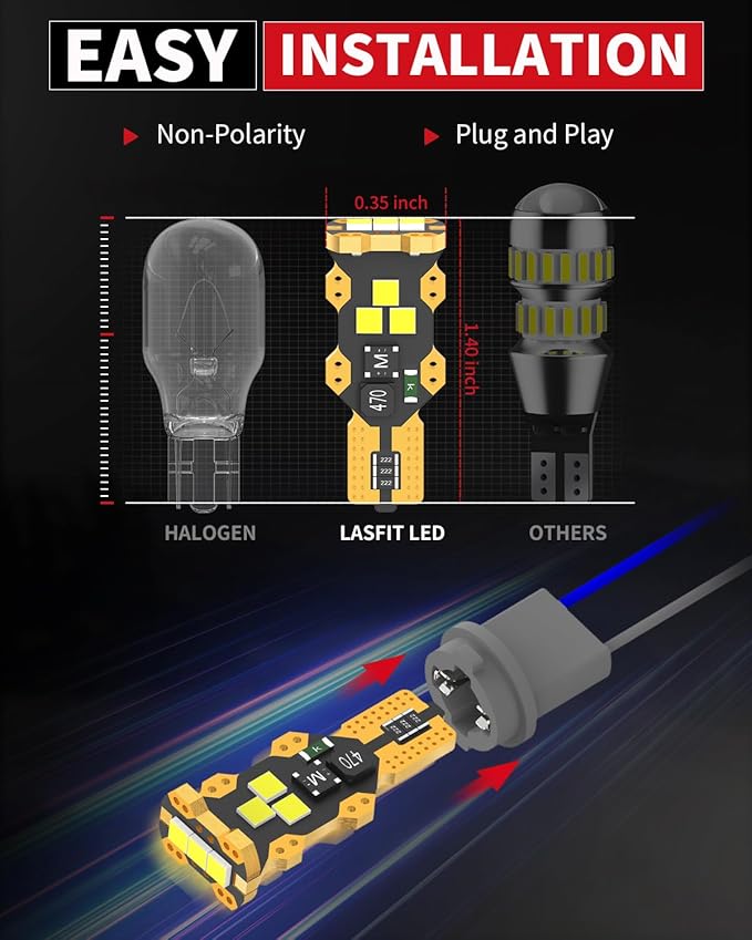 - 【Easy to Install】Designed to replace halogen bulbs, this LED is a perfect 1:1 fit. It's non-polarity, meaning no need to worry about positive or negative connections—just plug it in and you're good to go. It fits a wide range of sockets like 921, 912, T15, 906, 904, 902, 922, W16W, and more. It's ideal for reversing lights, backup lights, and truck cargo lights. The bulb size is 0.35" x 1.4".