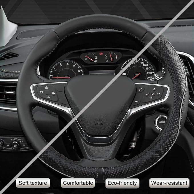- 【HIGH-QUALITY MATERIAL】 This steering wheel cover is made of high-quality microfiber leather, which is soft texture, comfortable, eco-friendly, wear-resistant, and durable.