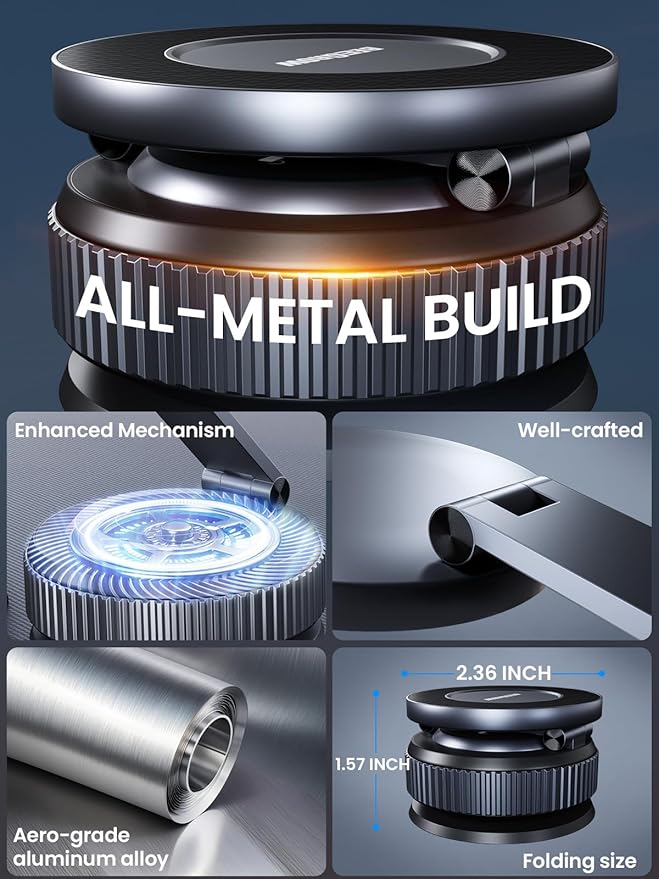 Magnetic Car Phone Holder for Magsafe, Alloy 360° Folding Cell Car Phone Mount with Ultra Stable Suction Cup and Reusable Gel, Dashboard Windshield Stand for iPhone 17-12 Android Pixel Samsung